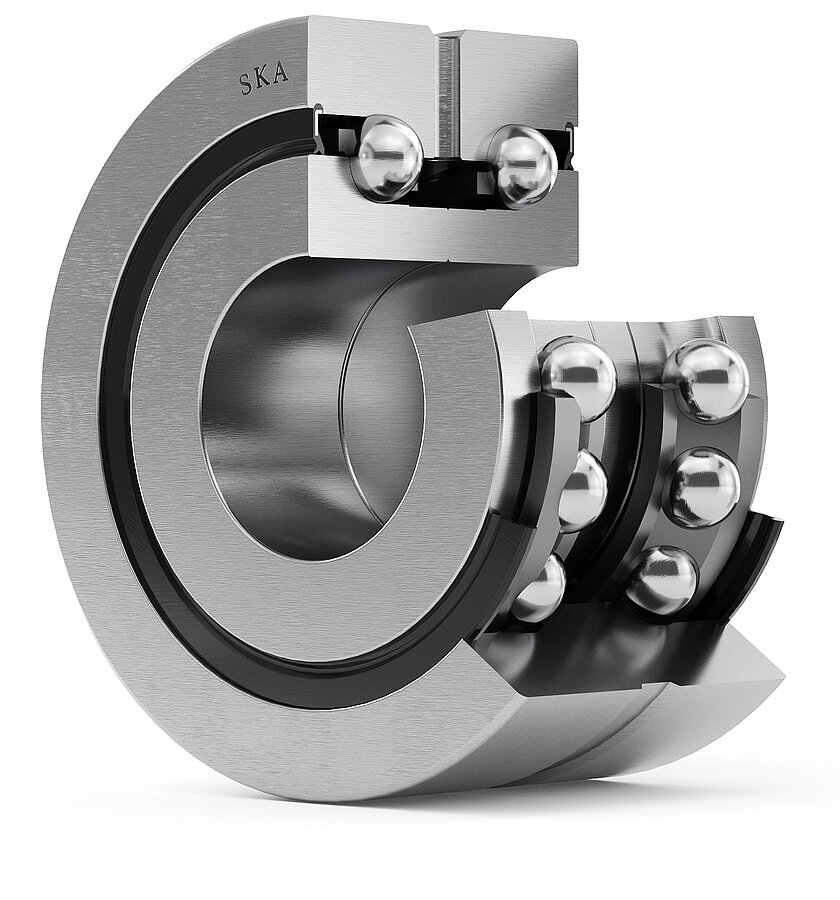 SKA® Axial-Schrägkugellager sind einbaufertige, ab Werk vorgespannte Lagereinheiten mit integrierten Dichtungen und Schmierstoffvorrat.